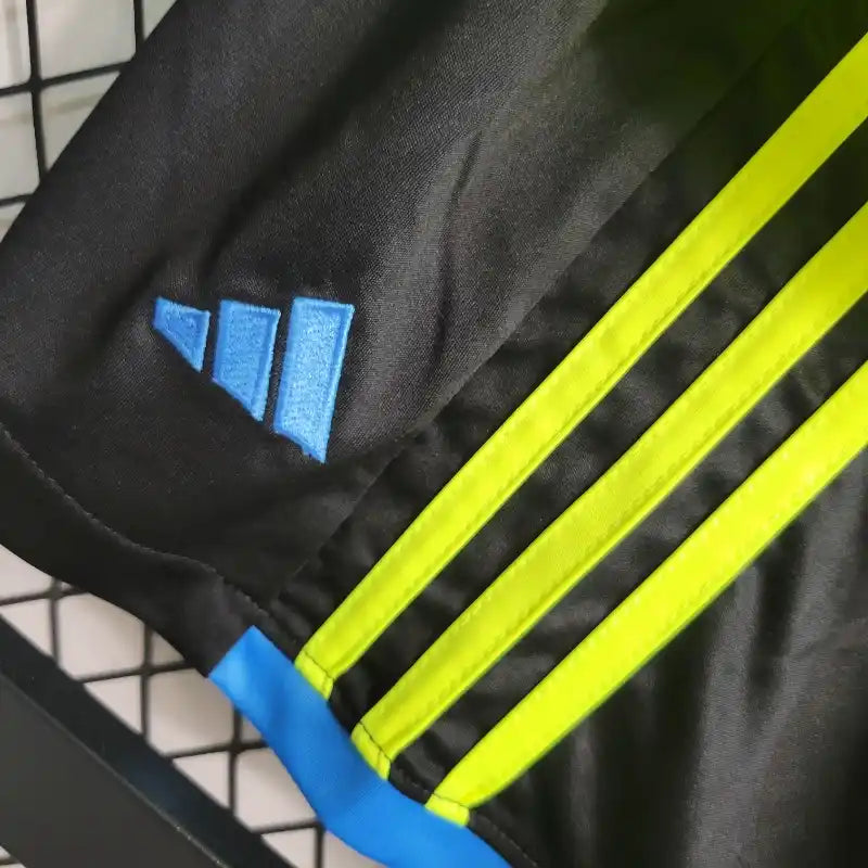 Ensemble Enfant Arsenal Extérieur 2023/2024 – Maillot + Short – Jaune Fluo ; Graphismes Noirs